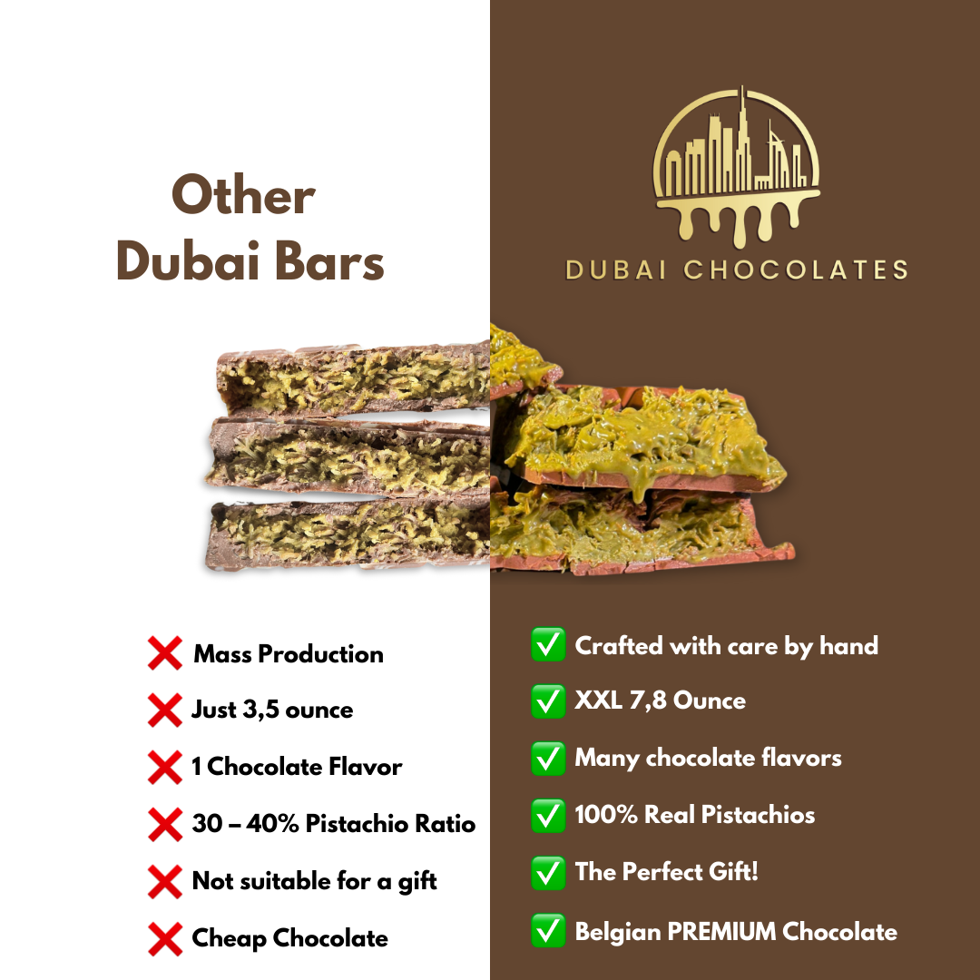 With our Dubai Bar, you don't have to worry about that. Our bars are deliciously crunchy, generously filled with premium pistachio sauce, and made from high-quality chocolate. With us, what you see is what you get.